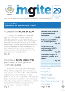 1 INGITE INSTITUTO DE GRADUADOS EN INGENIERÍA E INGENIEROS TÉCNICOS DE ESPAÑA Número 29 Noviembre 2019 EDITORIAL • Pág. 3 ¿Sabías que “ser Ingeniero es un Grado”? I Congreso del INGITE en 2020 Entrevista a Benito Vizoso Vila , presidente de los Ingenieros Técnicos Navales Benito Vizoso Vila es el presidente del Colegio Oficial de Peritos e Ingenieros Técnicos Navales, una institución que en los últimos años se ha modernizado y adaptado a las nuevas tecnologías. “Nuestra profesión, dice, no solo se reduce a la construcción del buque en general si no que abarca otras muchas otras actividades como pueden ser: peritaciones, sociedades de clasificación, modificaciones, reparaciones y mantenimientos o remolques marítimos”. (Pág. 4) El Instituto de Graduados en Ingeniería e Ingenieros Técnicos de España organiza su I Congreso, que tiene previsto celebrarse en Madrid en primavera de 2020. Tiene como objetivo principal la revisión y puesta al día de los perfiles profesionales. También se mostrarán los proyectos y oportunidades que se abren a las aplicaciones de la ingeniería técnica… de los negocios, las redes sociales, la práctica jurídica y los servicios innovadores para los ciudadanos. (Pág. 12) COLEGIOS / ASOCIACIONES AGRÍCOLAS FORESTALES INDUSTRIALES OBRAS PÚBLICAS TELECOMUNICACIONES TOPÓGRAFOS • Págs. 19-33 Reunión entre el INGITE y representantes de estudiantes • Pág. 10 Peticiones de INGITE a los partidos políticos • Pág. 15 El Certificado de profesionales INGITE: sello de calidad • Pág. 16 Islandia ha acogido la Asamblea General de la FEANI • Pág. 18