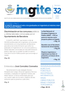 1 INGITE INSTITUTO DE GRADUADOS EN INGENIERÍA E INGENIEROS TÉCNICOS DE ESPAÑA Número 32 Julio 2021 EDITORIAL • Pág. 3 El INGITE denuncia el veto a los graduados en ingeniería al máximo nivel de la Función Pública Discriminación en los concursos públicos y ofertas laborales convocadas por el Ayuntamiento de Barcelona Entrevista a José González Granados Recientemente ha sido reelegido Decano- Presidente del Colegio Oficial de Ingenieros Técnicos Forestales y Graduados en Ingeniería Forestal y del Medio Natural. Le hemos entrevistado para que nos cuente cuáles son los retos y objetivos de esta institución para los próximos cuatro años. (Pág. 4) El INGITE y METGEC, que reúnen a más de 350.000 profesionales de la ingeniería, se ha reunido recientemente con el Ayuntamiento de Barcelona para denunciar la discriminación que sufren los graduados en Ingeniería en los concursos públicos y ofertas laborales convocadas por esta administración pública, dado que no pueden acceder al máximo nivel de la Función Pública puesto que se les exige un máster. (Pág. 20) NOTICIAS DE LAS ASOCIACIONES AGRÍCOLAS FORESTALES INDUSTRIALES INFORMÁTICOS MINAS OBRAS PÚBLICAS MINAS Y ENERGÍA TOPÓGRAFOS • Págs. 28-41 La Red Network of European Engineers in Politics (NEEP – EYE) se pone en marcha como proyecto piloto en España • Pág. 14 Reunión con el Secretario General de Universidades • Pág.20 Mujeres ingenieras e ingeniosas escriben el presente y el futuro de la Ingeniería • Pág. 22